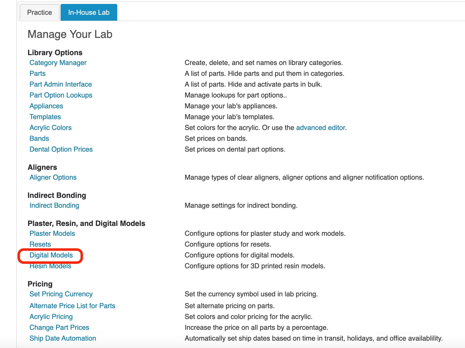 Here you will designate dropdown choice that will show on your [Models] tab when on the Prescription Workspace for submitting to your In-House lab.
