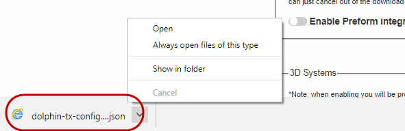 Browse to the Folder where your exported the dolphin-tx-configuation.json file. If you are setting up the Dolphin integration on the same machine where you exported the file, the file will be in your browser default download folder, which is usually DOWNLOADS. Once you have highlighted the file, click [Open].
