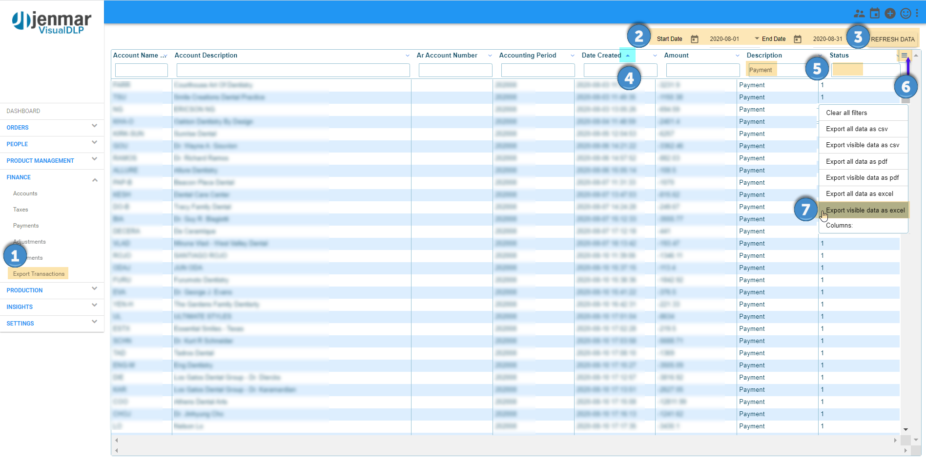 Example: To generate a spreadsheet of the Payment Transaction History for the month of August, 2020, enter the Start Date 8/1/2020, End Date 8/31/2020 and click Refresh Data. Type "Payment" in the Description column header. Click the Create Date column header to sort ascending or descending. Click the menu button to access additional options. Click to select Export Visible Data as Excel. Rename the file "Payment Transaction History August 2020" and browse to the directory to which you want to save it.