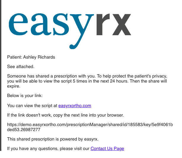 -The email will be sent from "Support@EasyRxOrtho.com" --- if your recipients do not get the email, kindly advise them to check spam / trash / junk email folders. It typically will go into their inbox.
