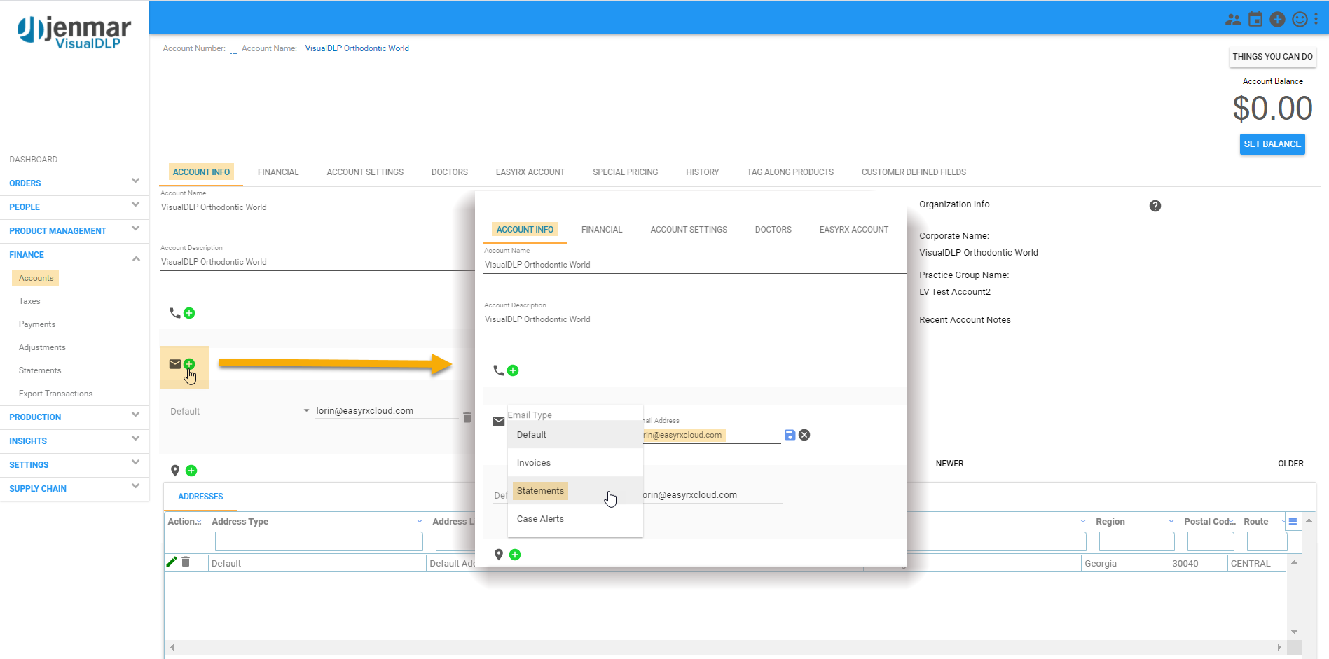Note: You may add an email address multiple times for optional purposes such as "Default, Invoice, Statements, and Case Alerts."