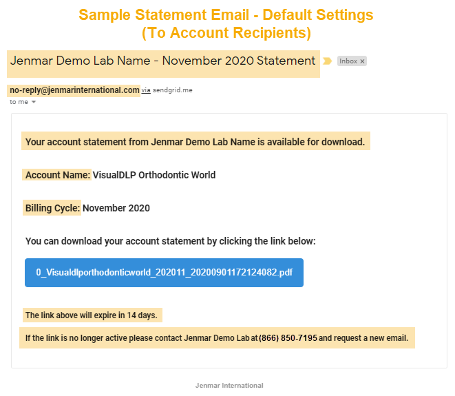 *Email Body | "Your account statement from Lab Name is available for download." | Example: Your account statement from Jenmar Demo Lab is available for download. |