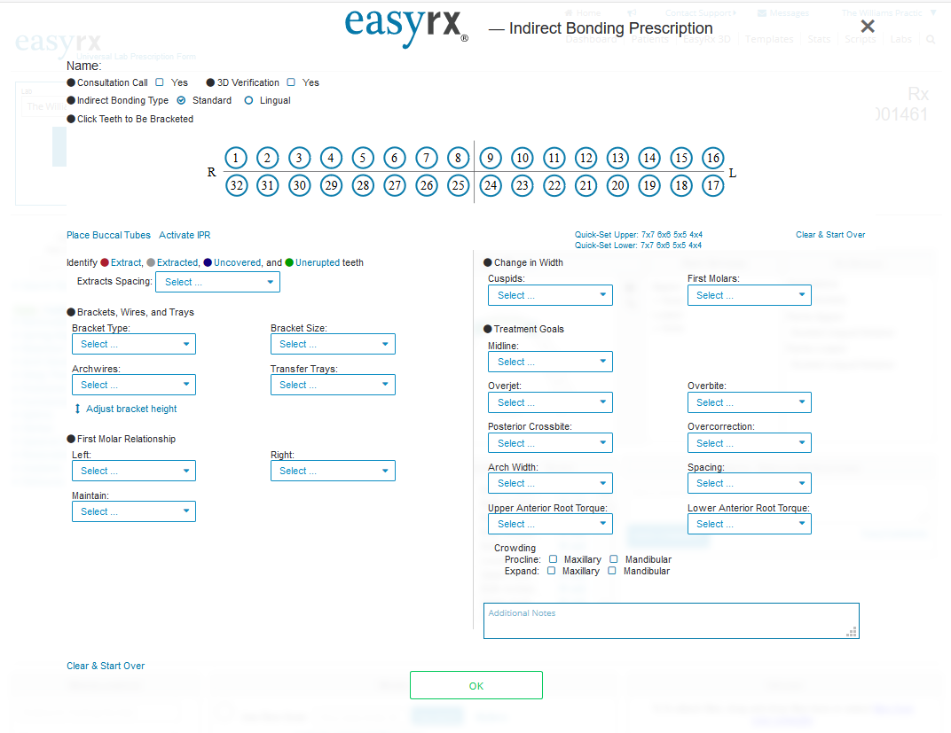 Ask and you receive! We have received numerous requests to improve the Indirect Bonding Prescription form. In this update, the EasyRx Prescription Workspace has been updated to provide a more thorough Indirect Bonding Prescription Form. Practices can access this form by going to [Create Rx], then on the Prescription Workspace, selecting the [Indirect Bonding] tab located below the canvas.