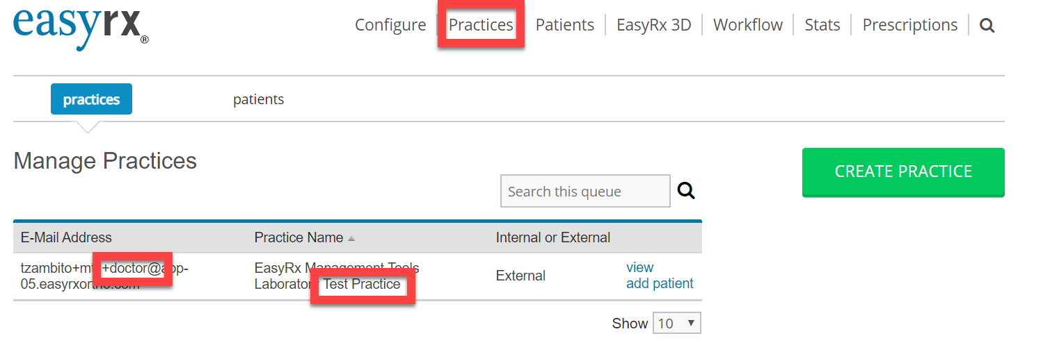 To access your Practice login, go to your [Practices] menu item. Look for a practice that has "..Lab Test Practice" in the Practice Name as shown below. You will want to copy / write that E-mail address for that account down. This is your Login email for the test practice.